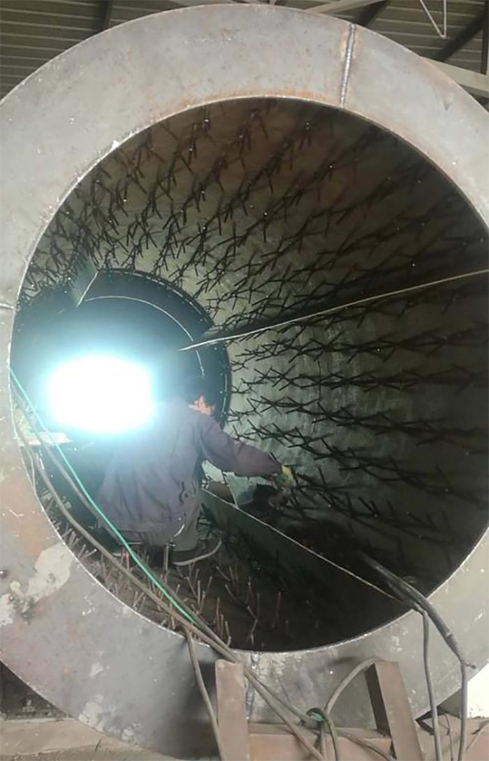 另外,部分回轉(zhuǎn)窯采用輕質(zhì)澆注料或者纖維板等作為隔材料,工作層采用重質(zhì)澆注料(金屬抓釘錨固)雙層澆注結構,可以合理控制回轉(zhuǎn)窯外壁溫度。該結構采用金屬件把耐火材料和筒體連為一體,不存在耐火磚脫落問題,但是金屬件焊接質(zhì)量和澆注料中水份烘干排出是關鍵。