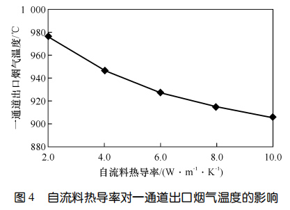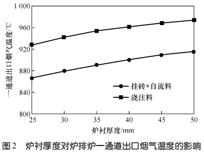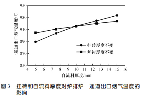 2、對于掛磚+自流料爐襯,掛磚厚度不變時,自流料厚度越大,一通道出口煙氣溫度越高;爐襯總厚度不變時,掛磚越厚、自流料層越薄,一通道出口煙氣溫度越低;爐襯各工作層厚度固定時,一通道出口煙氣溫度隨自流料熱導(dǎo)率的升高而降低,通過調(diào)整自流料熱導(dǎo)率,一通道出口煙溫差值可達(dá) 70 ℃。