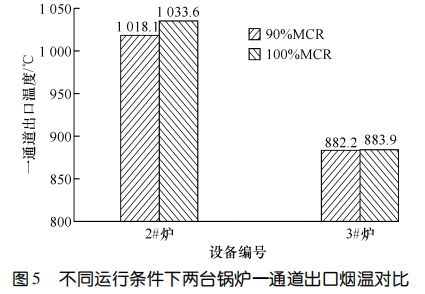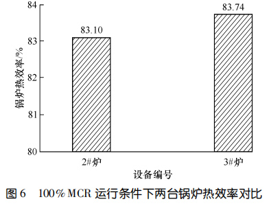 兩臺設(shè)備運行 11 個月后進(jìn)行了能效測試。圖5對比了 90%鍋爐大的連續(xù)蒸發(fā)量(簡稱 MCR)和MCR 條件下鍋爐一通道的出口煙溫。圖6示出了MCR運行條件下兩臺鍋爐熱效率的對比。結(jié)果顯示:在 90%MCR 運行條件下,3#爐一通道出口煙溫比2#爐低 135.9 ℃,在MCR 運行條件下,3#爐一通道出口煙溫比 2#爐低 149.7 ℃,3#爐的熱效率比 2#爐高 0.64%。相較而言,使用膜式壁爐襯的3#爐在負(fù)荷相當(dāng)?shù)那闆r下,余熱鍋爐熱效率更高。