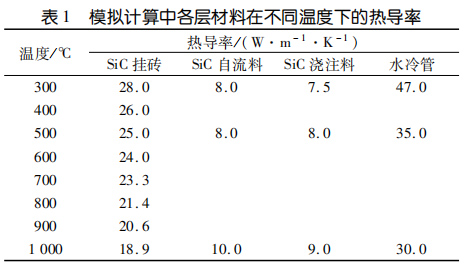 水冷壁內(nèi)襯的熱傳導(dǎo)性能需要與爐況相匹配,既要盡可能多地將熱量傳導(dǎo)出去發(fā)電,又要保證一通道出口溫度不低于 850℃。模擬計算設(shè)定耐火材料熱導(dǎo)率恒定,暫不考慮使用過程中耐火材料組成變化對熱導(dǎo)率的影響和爐襯表面積灰對爐襯熱傳導(dǎo)的影響也不考慮掛釘和錨固釘對熱傳導(dǎo)的影響。進(jìn)行模擬計算時,水冷壁內(nèi)襯各工作層選取的熱導(dǎo)率見表1。