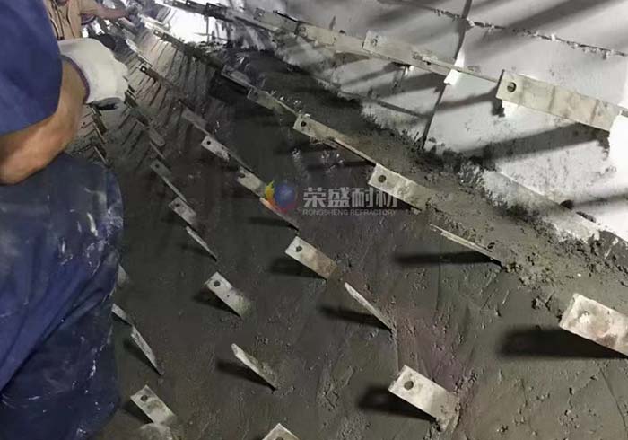 高溫段因需要考慮耐火以及耐磨等因素則采用重質(zhì)澆注料加輕質(zhì)澆注料相結(jié)合的復(fù)合結(jié)構(gòu),鏈篦機(jī)爐頂和高溫段側(cè)墻一般采用錨固磚結(jié)合澆注料的形式,但在高溫段側(cè)墻水平方向上需鋪設(shè)一條托板,這樣做的好處是人為設(shè)置一條膨脹縫,可以較大程度地消除因?yàn)榕蛎泴?duì)錨固磚產(chǎn)生的破壞作用。
