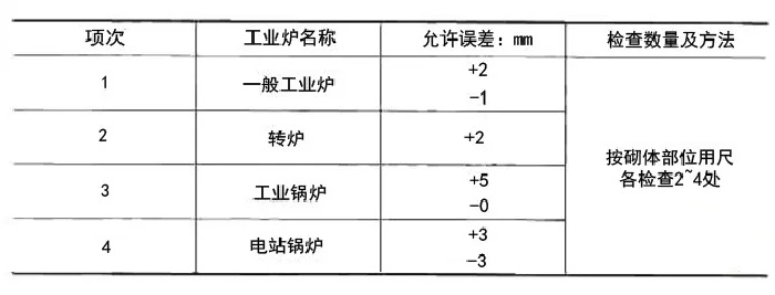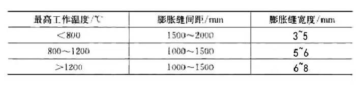 ②現(xiàn)場澆注的爐體?,F(xiàn)場澆注的耐火澆注料爐體留設(shè)膨脹縫的間距和寬度??蓞⒖急?所示。表中數(shù)值適用于黏土質(zhì)和高鋁質(zhì)耐火澆注料。