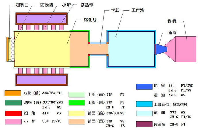 為了減少死角,以利于玻璃液的流動(dòng),我們將熔化池的前池墻磚體設(shè)計(jì)為八字形。